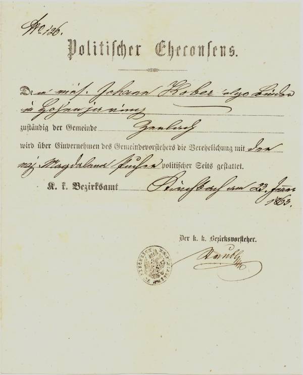 Politischer Eheconsens - ausgestellt 1863 vom Bezirksgericht in Kirchbach