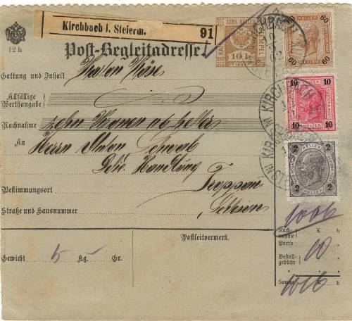 Paketkarte zu 10 Heller mit Zusatzfrankatur für ein Paket nach Troppau - 1902